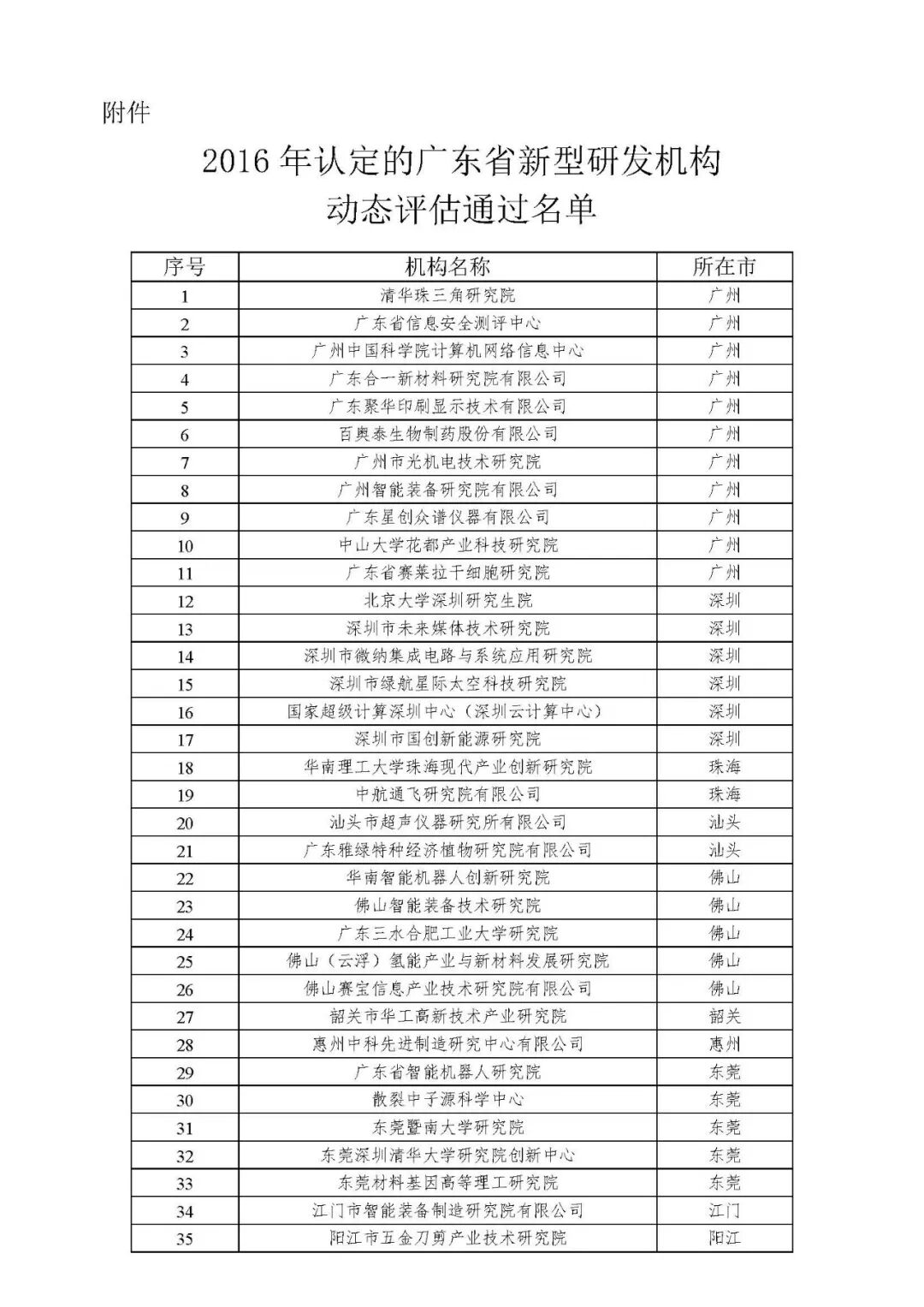 附件:2016年认定的广东省新型研发机构动态评估通过名单