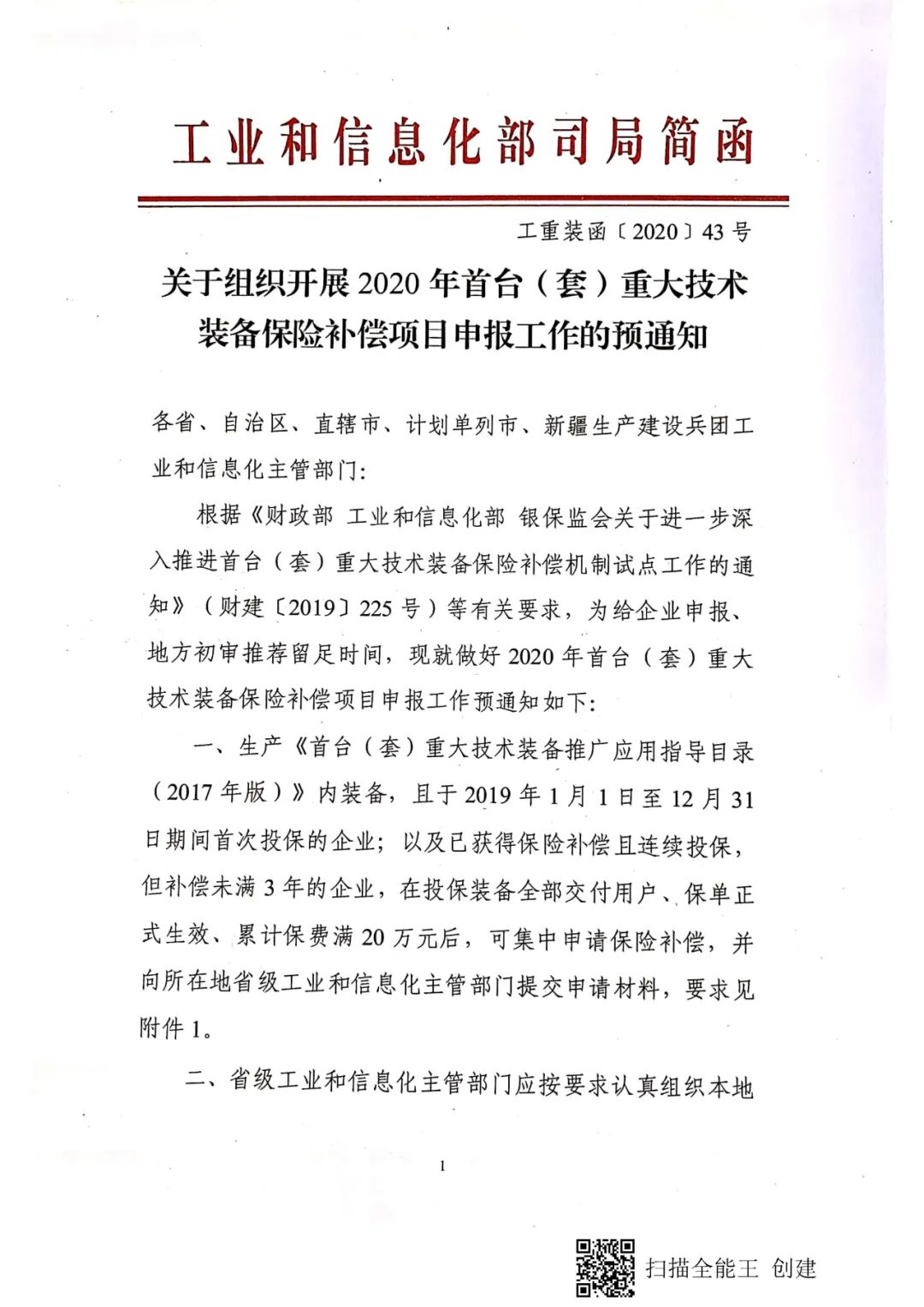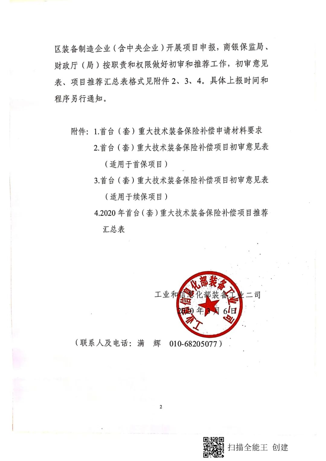 附件:工业和信息化部装备工业二司关于组织开展2020年首台(套)重大技术装备保险补偿项目申报工作的预通知
