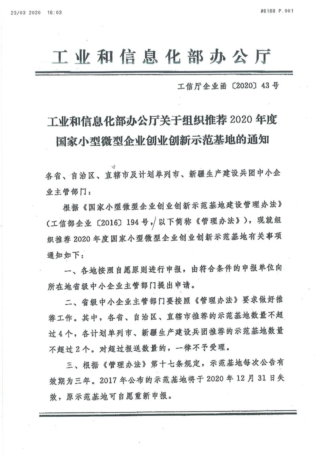 根据《工业和信息化部办公厅关于组织推荐2020年度国家小型微型企业创业创新示范基地的通知》(工信厅企业函〔2020〕43号,见附件)和工业和信息化部《国家小型微型企业创业示范基地建设管理办法》(工信部企业〔2016〕194号,以下简称《管理办法》)要求,现就组织推荐2020年度国家小型微型企业创业创新示范基地有关事项通知如下: