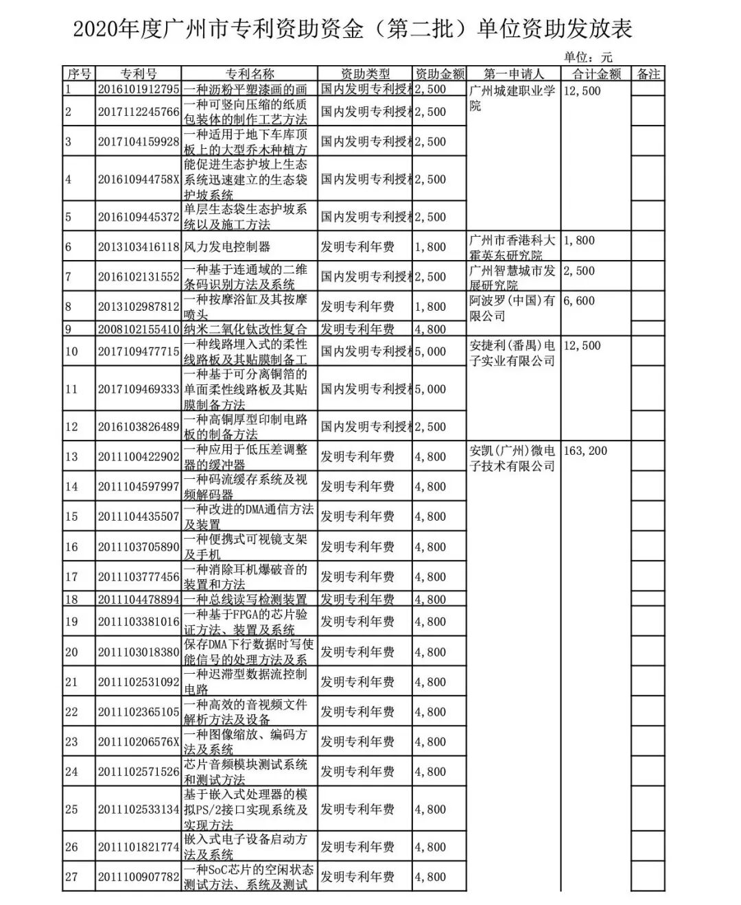 1:2020年度广州市专利资助资金(第二批)单位资助发放表