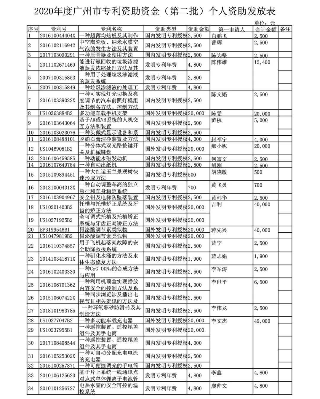 2:2020年度广州市专利资助资金(第二批)个人资助发放表