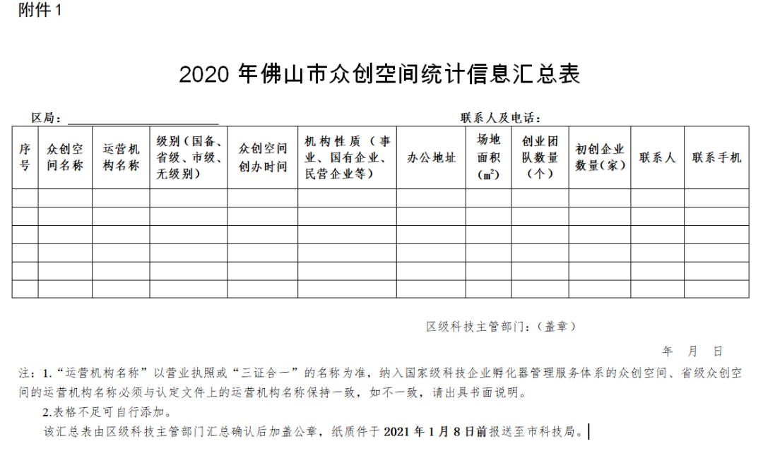 佛山市科学技术局关于开展2020年度科技企业孵化器、众创空间统计工作的通知