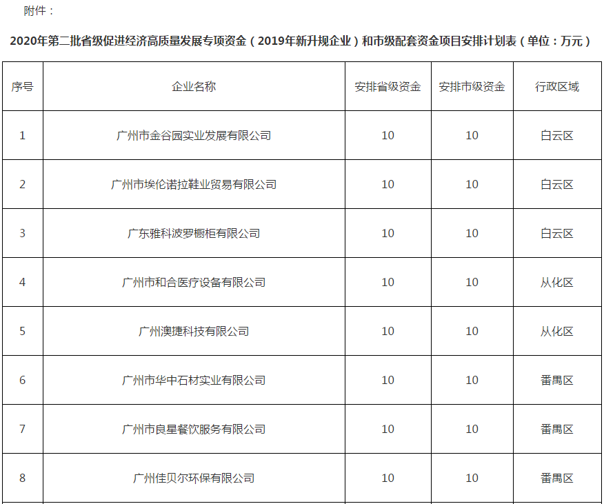 广州市工业和信息化局关于2020年第二批省级促进经济高质量发展专项资金(2019年新升规企业)和市级配套资金项目安排计划的公示