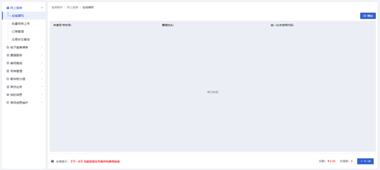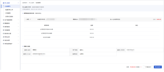 新增完费用后,在展示界面可以进行费用增加、修改、删除操作。若无修改,核对拟缴费用种类、金额等无误后,输入缴费人信息如邮箱、手机号、地址等,点击右下角“下一步”按钮后;依次再点击“下一步(预览)”、“生成订单”等按钮,进入到“网上缴费订单页”。