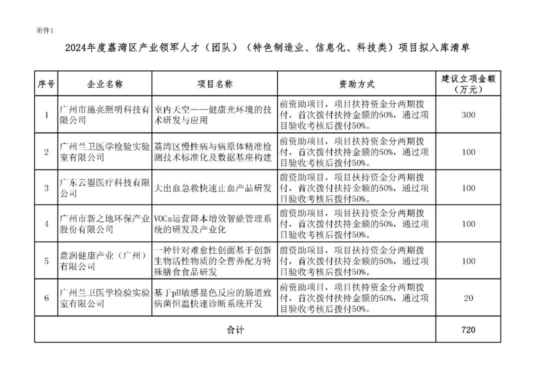 根据《关于印发<广州市荔湾区产业领军人才(团队)支持计划实施办法>的通知》(荔科工信规〔2023〕2号)有关文件要求,我局开展了2024年度荔湾区产业领军人才(团队)(特色制造业、信息化、科技类)项目扶持资金申报工作。经过公开受理、形式审查、专家评审等程序,初步形成了《2024年度荔湾区产业领军人才(团队)(特色制造业、信息化、科技类)项目拟入库清单(附件),共有6个项目。现予以公开,公示时间为2025年9月18日至2025年9月25日。