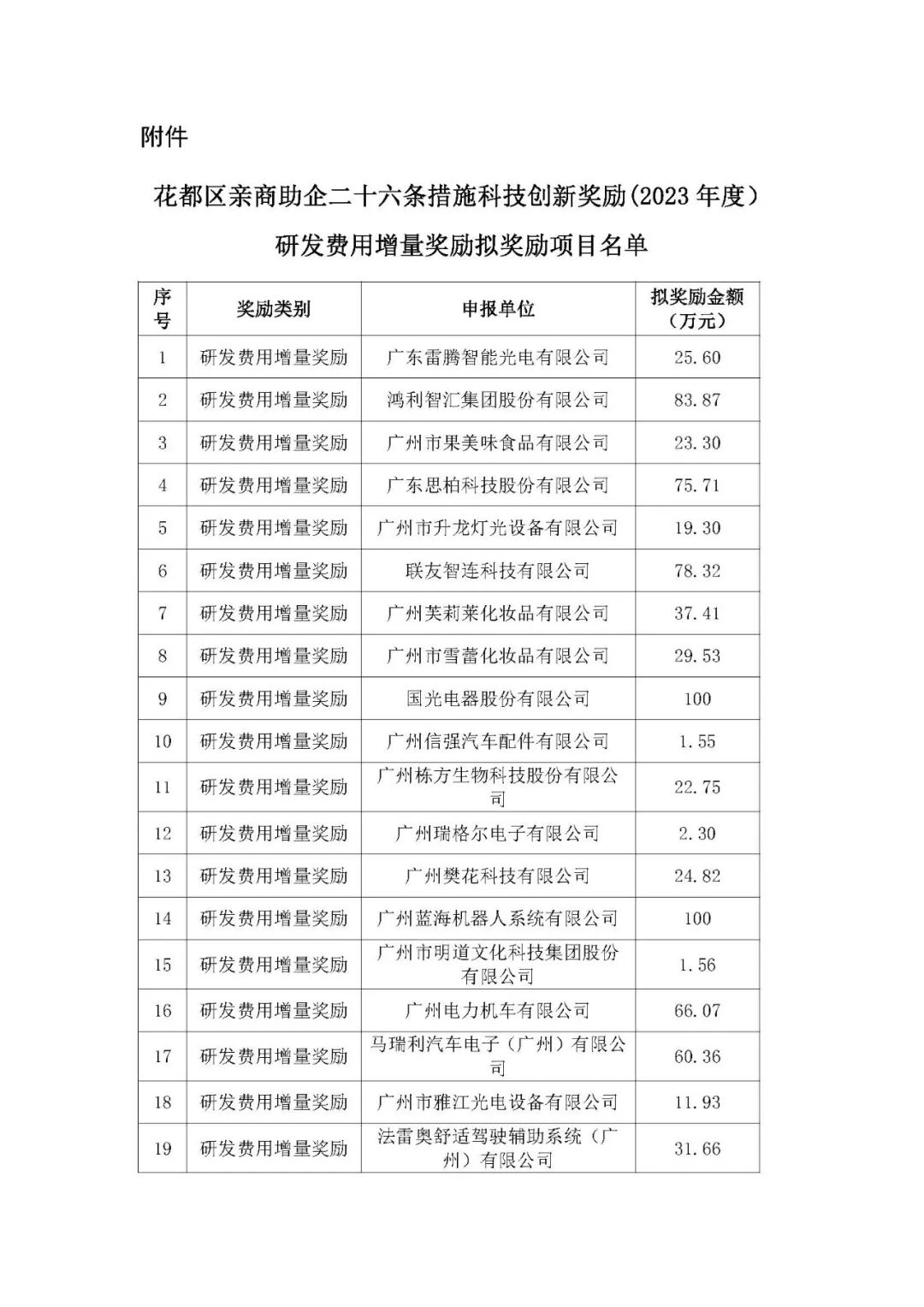 根据《花都区亲商助企二十六条措施》(花府办规〔2023〕4号)及申报指南有关规定,现对花都区亲商助企二十六条措施科技创新奖励(2023年度)研发费用增量奖励拟奖励项目名单予以公示。