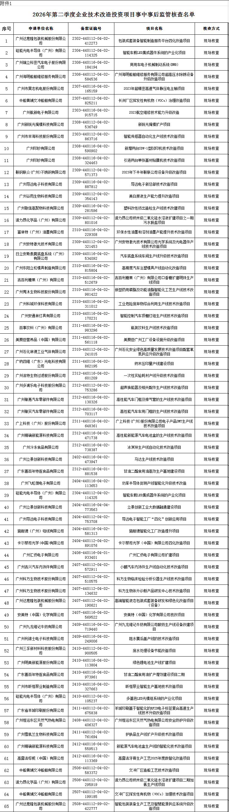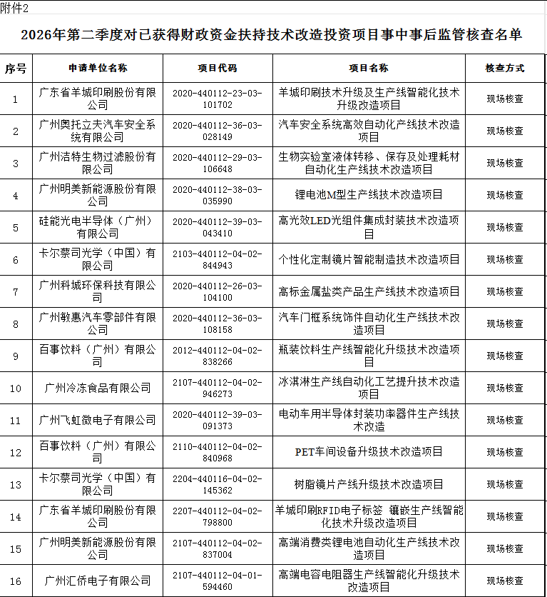 根据《企业投资项目事中事后监管办法》(国家发展改革委令第14号)、《广东省发展和改革委员会 广东省工业和信息化厅印发<关于企业投资项目核准和备案管理的实施办法>的通知》(粤发改规〔2022〕1号)等有关文件精神,按照“双随机、一公开”原则,现拟定于2026年二季度到附件名单所涉及企业开展技术改造投资项目事中事后监管核查工作,核查内容如下: