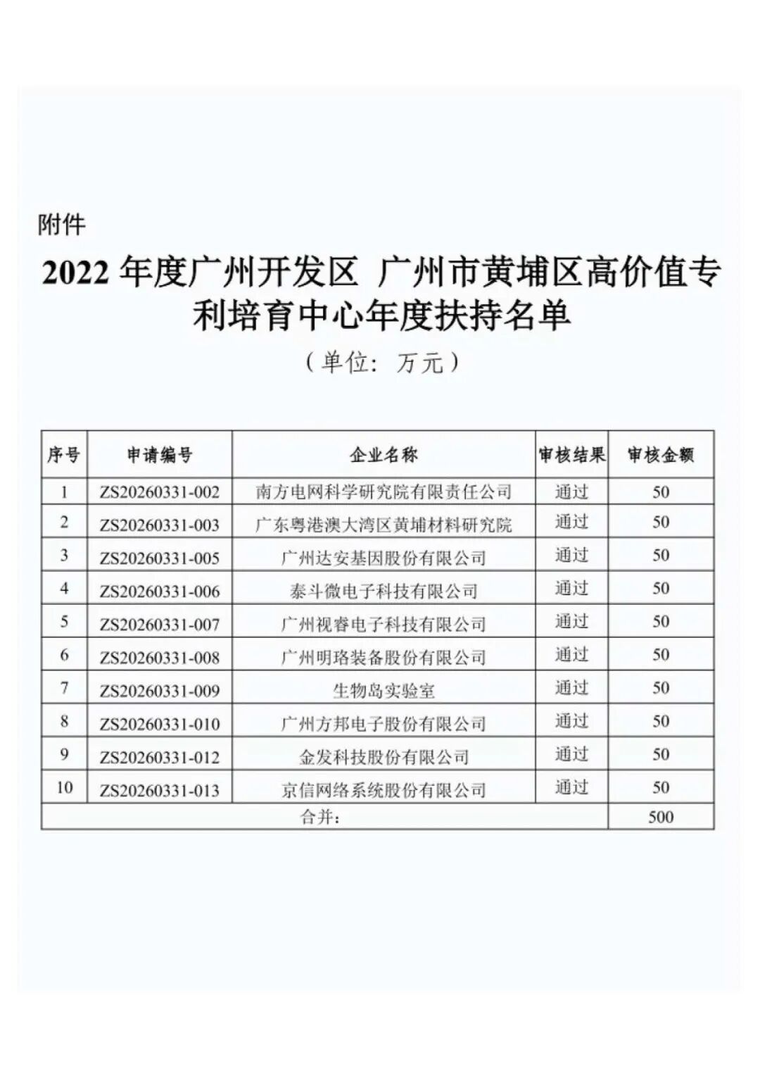 南方电网科学研究院有限责任公司等10家单位的10项“免申即享”项目符合2022年度广州开发区 广州市黄埔区高价值专利培育中心年度扶持政策规定,按程序予以补充发放资助费用人民币共计伍佰万元整(¥5,000,000)。请有关单位收到通知后于2026年4月8日(星期三)至4月10日(星期五),登陆黄埔兑现通-政策兑现综合服务平台 http://zcdx.gdd.gov.cn/,上传《收款确认函》和《承诺函》(模板可在兑现系统中自行下载)在线办理资金拨付申请,逾期未办理的,视为放弃本次资助。